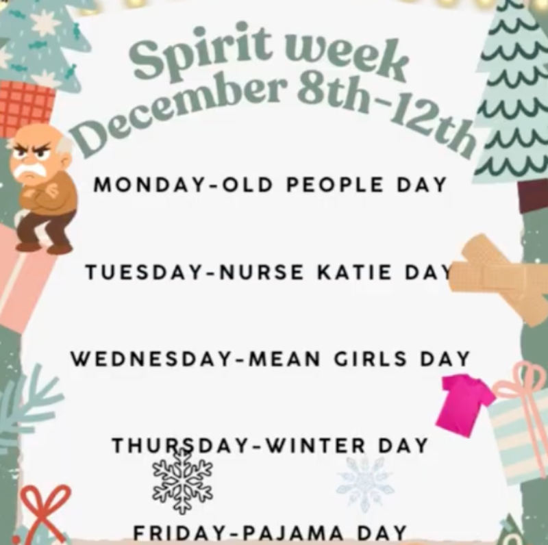 We are excited to announce our next Spirit week starting Monday 12/8. If students choose not to participate in each day's theme they are expected to be in perfect dress code. If they are out of dress code a loaner will be provided and/or they will call to have a family member to bring in a change of clothes. Exception is Friday since that will still be FREE dress!