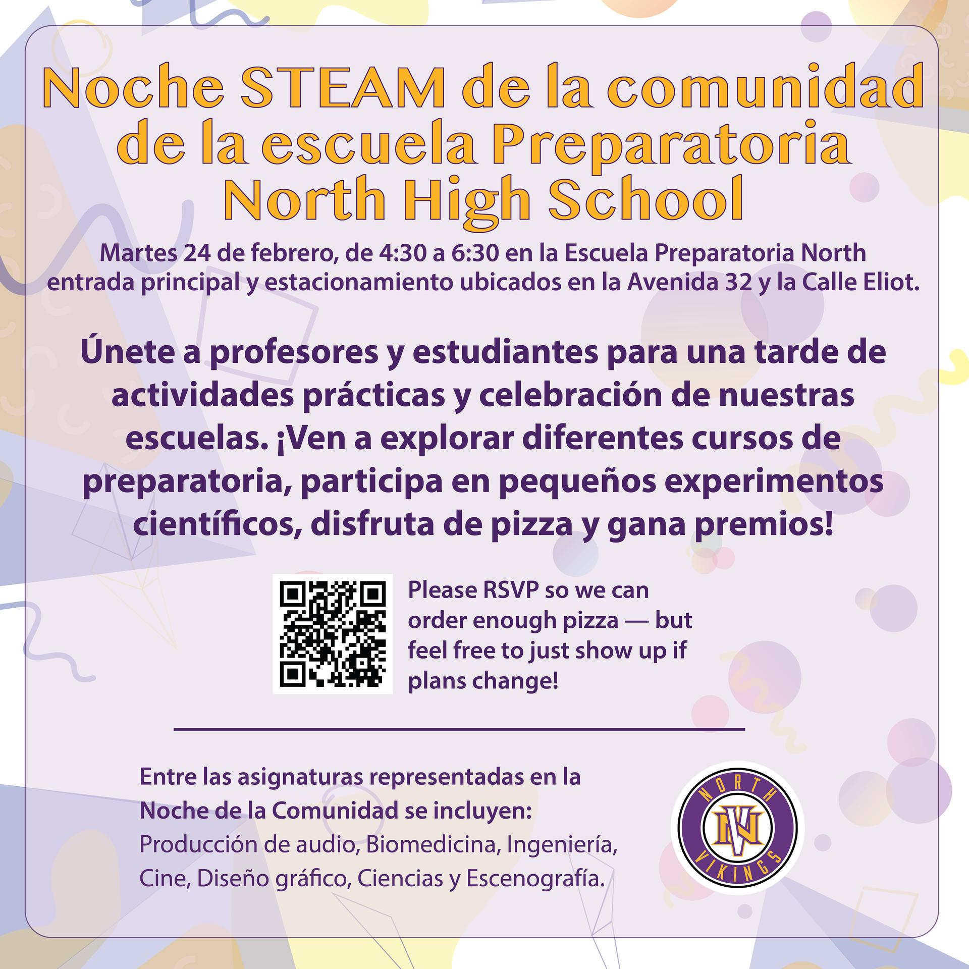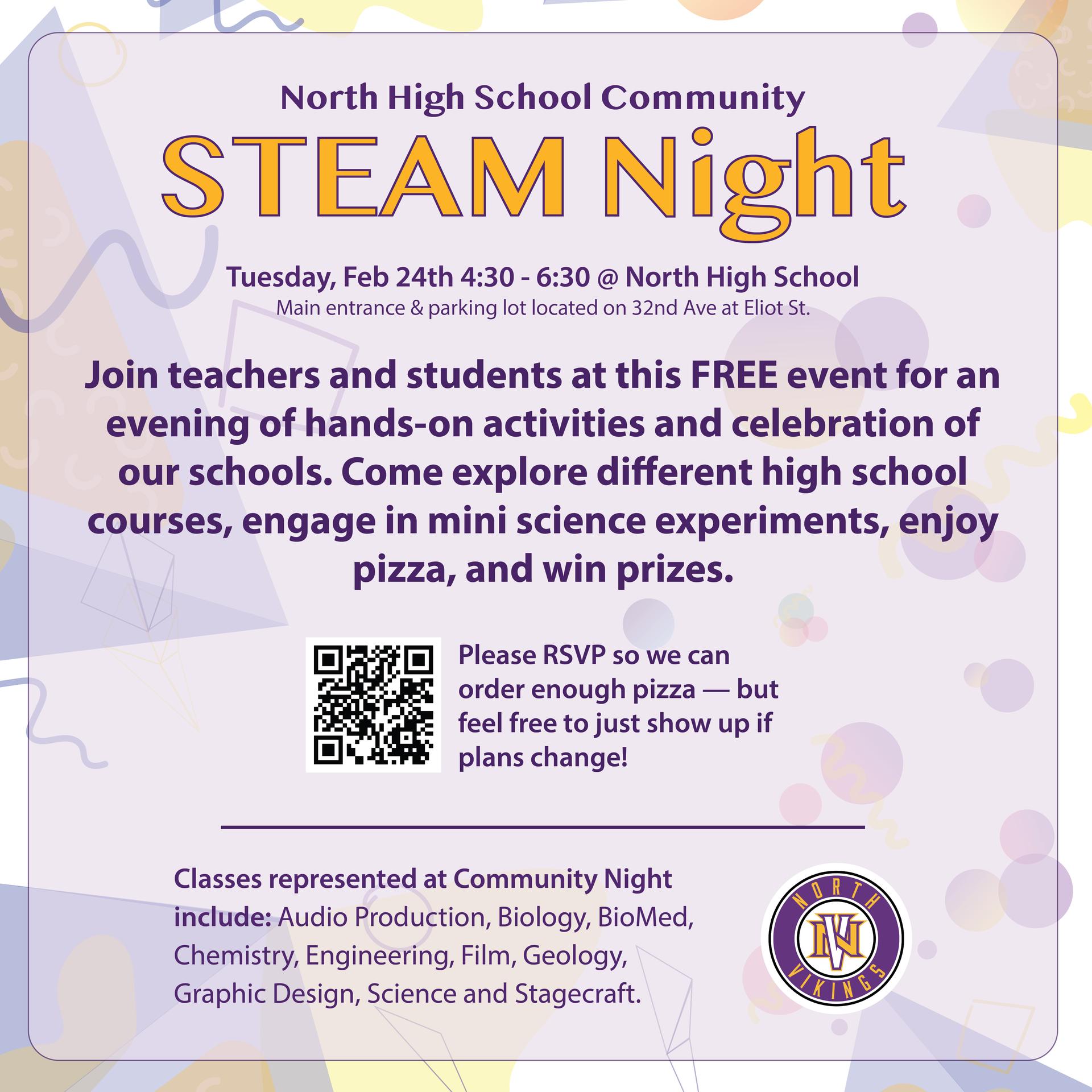 WHAT: North High Community STEAM Night - Hands on activities, FUN and pizza! WHO: Area teachers and Families with kids of all ages WHEN: Tuesday, February 24 from 4:30 - 6:30 pm WHERE: North High - Main entrance and parking lot located on 32nd Ave at Eliot St.