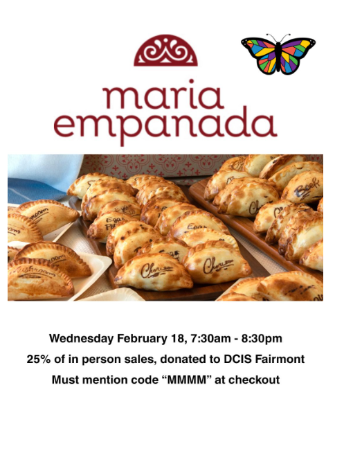 Olvídate de pensar qué preparar para la cena y reúne con otras familias de DCIS en Fairmont en Maria Empanada el miércoles 18 de febrero. La recaudación de fondos para DCIS estará disponible todo el día con el código “MMMM” al pagar, solo en persona. ¡Nos vemos allí! |