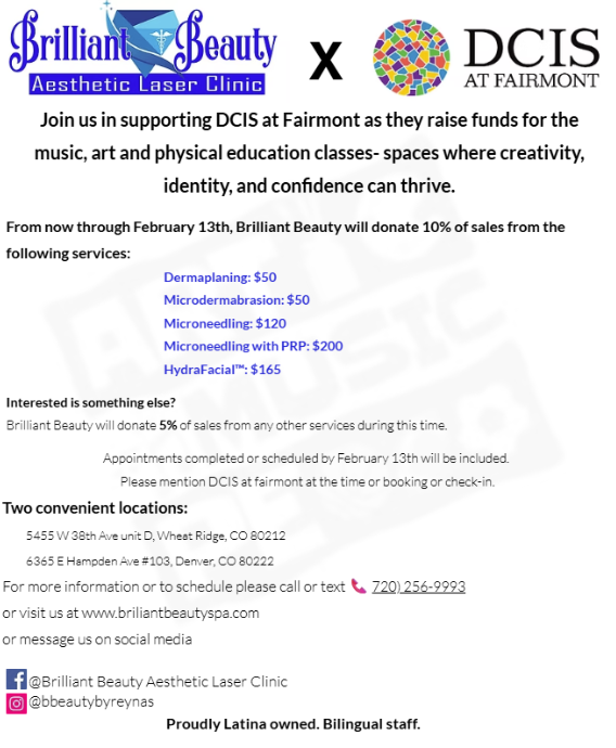 Local business Brilliant Beauty Aesthetic Laser Clinic is offering 10% back to the Fun Run for select services and 5% back on any service option that is completed or scheduled by February 13th. All staff speak spanish and english and they have locations in Wheat Ridge and Denver. Make sure to mention DCIS at Fairmont at time of booking and time of service. See flyer for more details.
