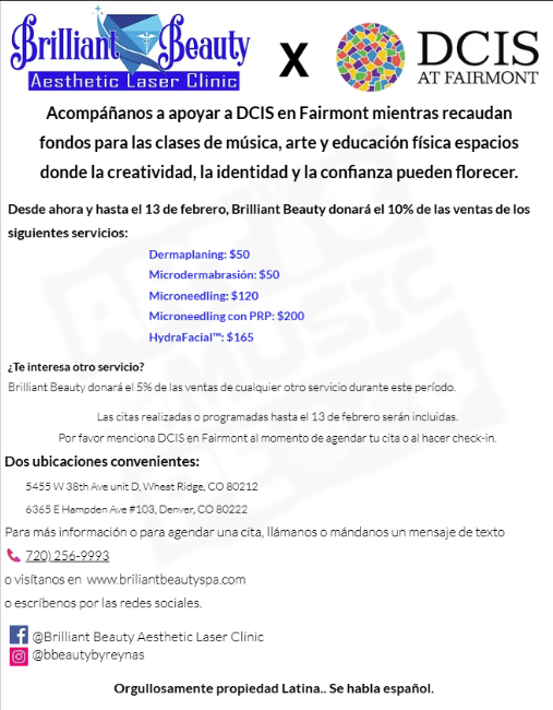 El negocio local Brilliant Beauty Aesthetic Laser Clinic está ofreciendo 10% de devolución para el Fun Run en servicios seleccionados y 5% de devolución en cualquier opción de servicio que se complete o se programe antes del 13 de febrero. Todo el personal habla español e inglés, y cuentan con ubicaciones en Wheat Ridge y Denver. Asegúrese de mencionar DCIS en Fairmont al momento de hacer la cita y nuevamente al recibir el servicio. Consulte el volante para más detalles.