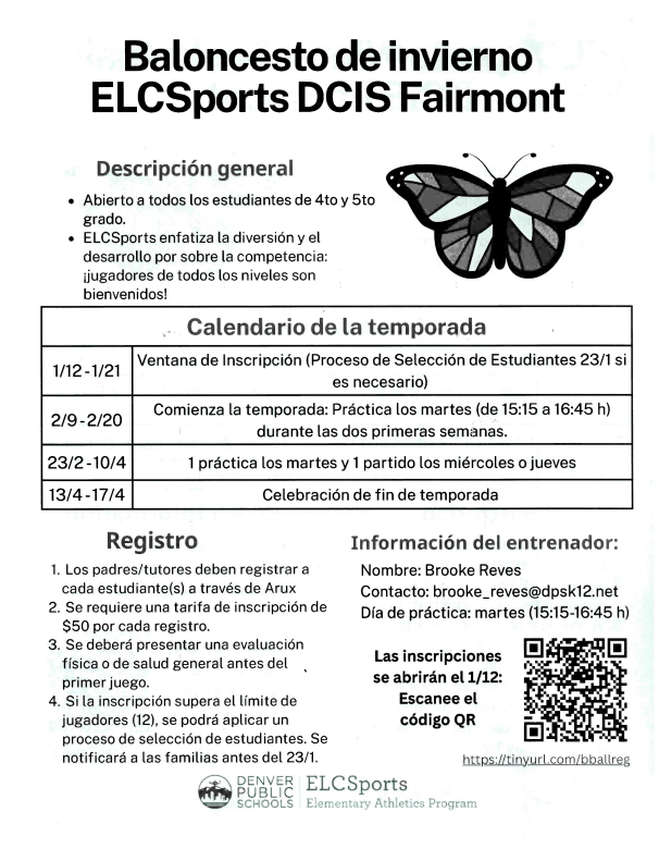 🏀 ELCSports Winter Basketball: Open to all 4th and 5th Grade Students🏀 🏀 Baloncesto de Invierno de ELCSports: Abierto para todos los estudiantes de 4.º y 5.º grado 🏀 |