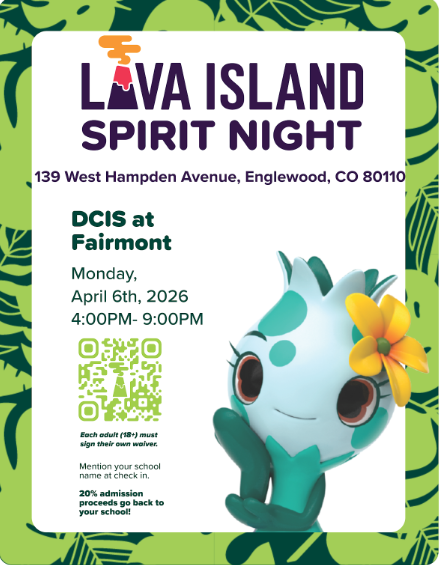 Get out the last of the spring break energy Monday evening April 6th, join us for a School Wide Playdate at Lava Island in Englewood from 4-9PM. Mention DCIS at check-in and 20% of admission proceeds go back to the school. |