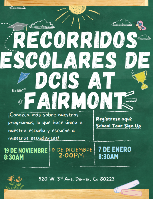 Nuestro próximo recorrido escolar para familias interesadas es el miércoles, 19 de noviembre a las 8:30am. Esta es una oportunidad fantástica para conocer nuestro ambiente de aprendizaje, conocer a nuestros dedicados maestros y ver qué hace que DCIS at Fairmont sea especial.