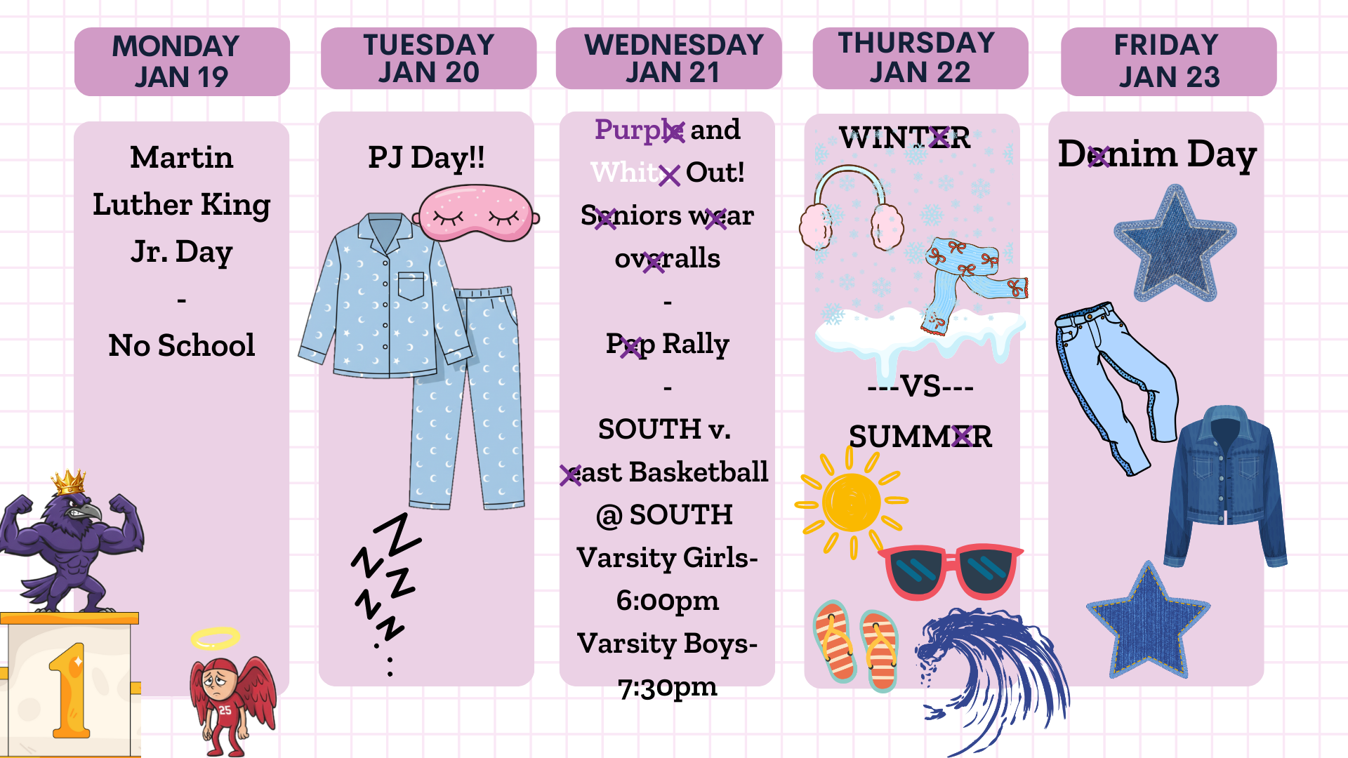 We hope you had another great week. Next week we kick off our winter spirit week! Below you will find the events and spirit days we will have.