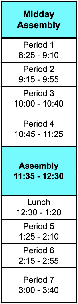 Enjoy a long weekend and celebrate Martin Luther King Jr Day, and remember, our Winter Pep Rally is on WEDNESDAY. Additionally, there are NO BLOCK periods next week, and we will not have seminar on Thursday. The alternate bell schedule for Wednesday and Thursday are below. Tuesday and Friday are regular 1-7 schedules.