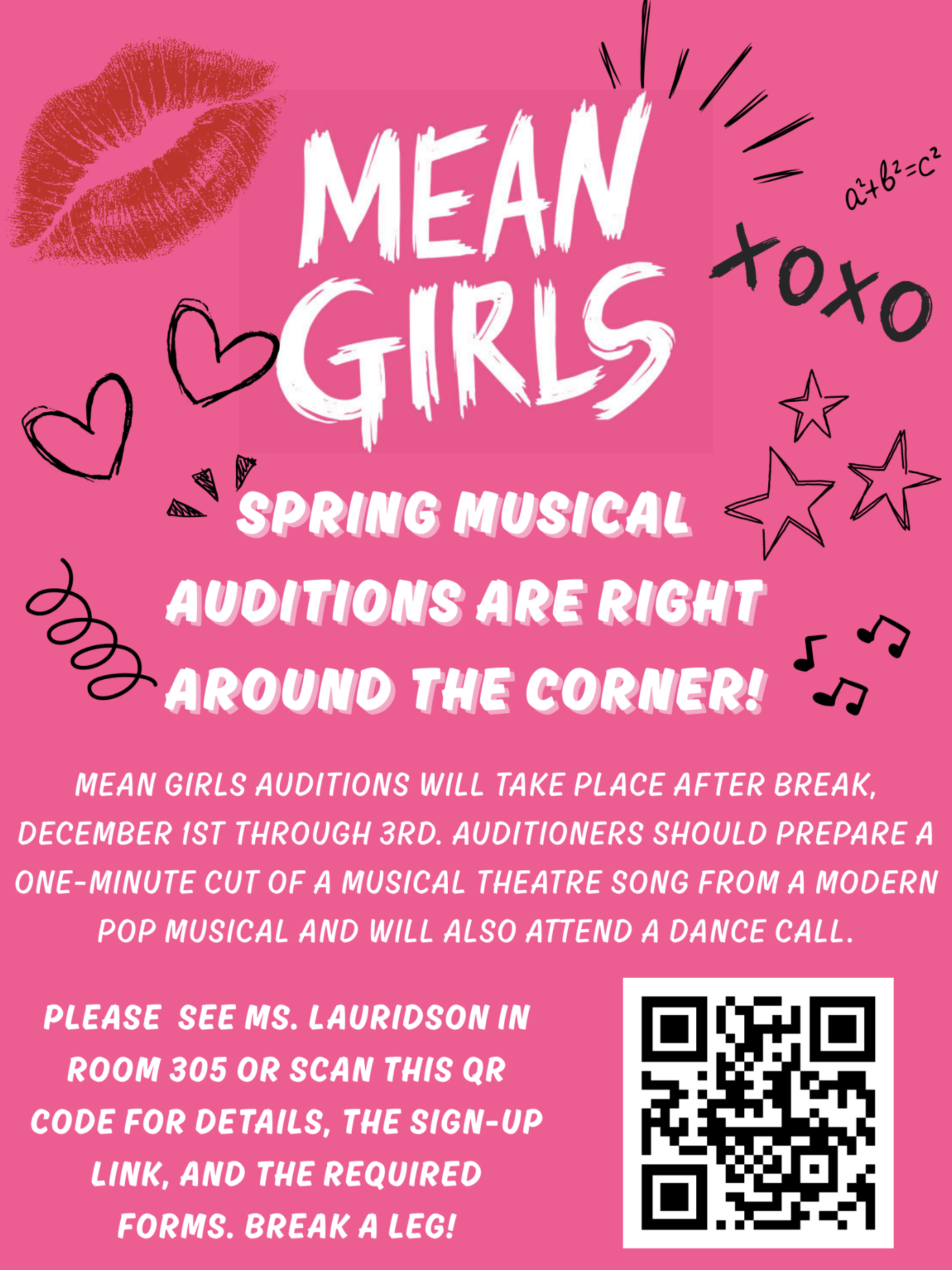 Spring musical auditions are right around the corner! Mean Girls auditions will take place after break, December 1st-3rd. Auditioners should prepare a one-minute cut of a musical theatre song from a modern pop musical and will also attend a dance call. Please see the posters around the school or see Ms. Lauridson in Room 305 for more details, the sign-up link, and the required forms. Break a leg! |