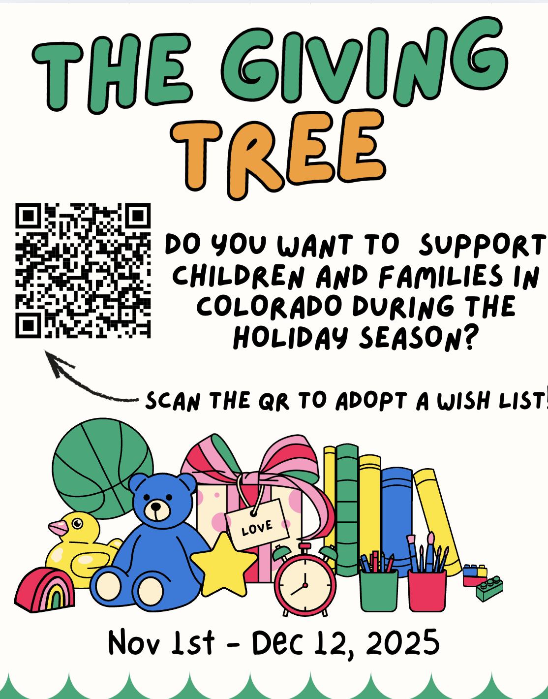The Giving Tree program supports underprivileged children in Colorado because everyone deserves to experience the joy of the holiday season. When you adopt a wish list, you are not just providing special holiday memories; you also ease the burden of a struggling family. This program has been fulfilling children's holiday wish lists from all different holidays like Christmas, Hanukkah, Kwanzaa, and more!