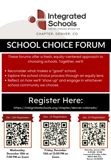 They are hosting a series of free community forums in December and January to help caregivers reflect on what matters most in their school choice process and to build understanding about why integrated, equitable schools benefit all children.