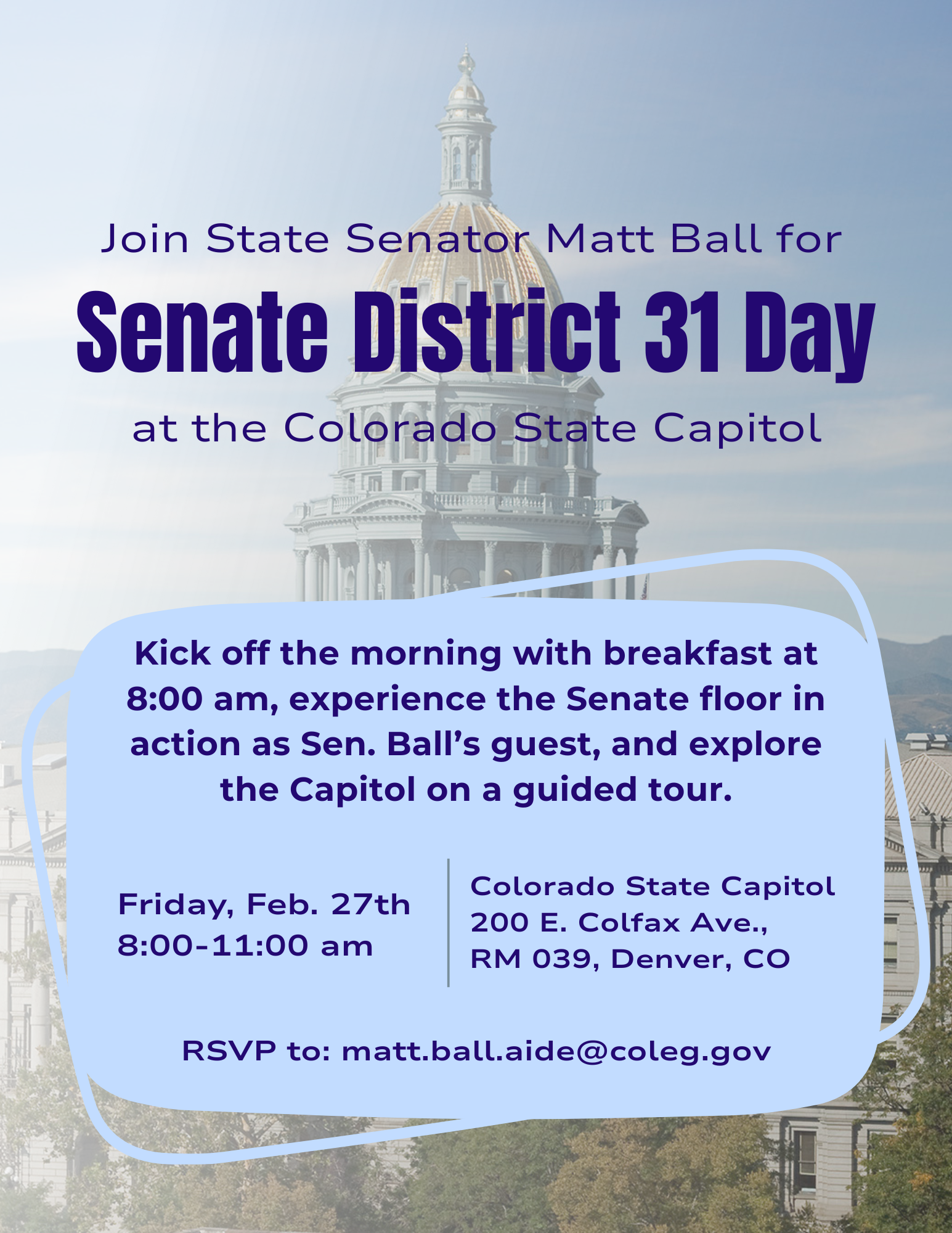 Consider joining Senator Ball for a Constituent Day for Colorado Senate District 31 on Friday, February 27th from 8:00am - 11:00am at the Colorado State Capitol.