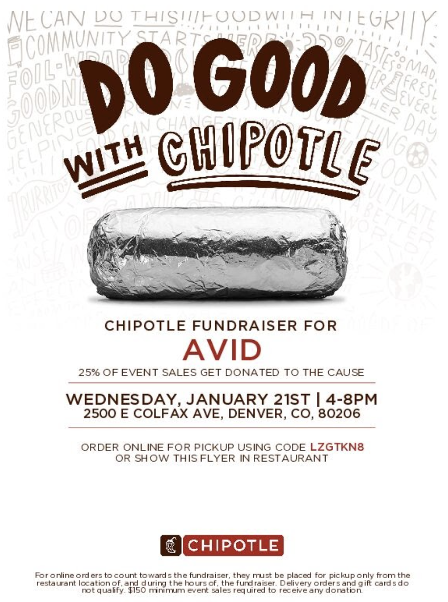 Foil your dinner plans and stop by the Chipotle at 2500 E Colfax Ave in Denver for our AVID fundraiser on Wednesday, January 21st from 4:00pm - 8:00pm. To ensure your support goes directly to our East AVID program, just show them this flyer or mention the fundraiser at checkout and they'll donate 25% of the proceeds to the cause! Thank you for your support! |