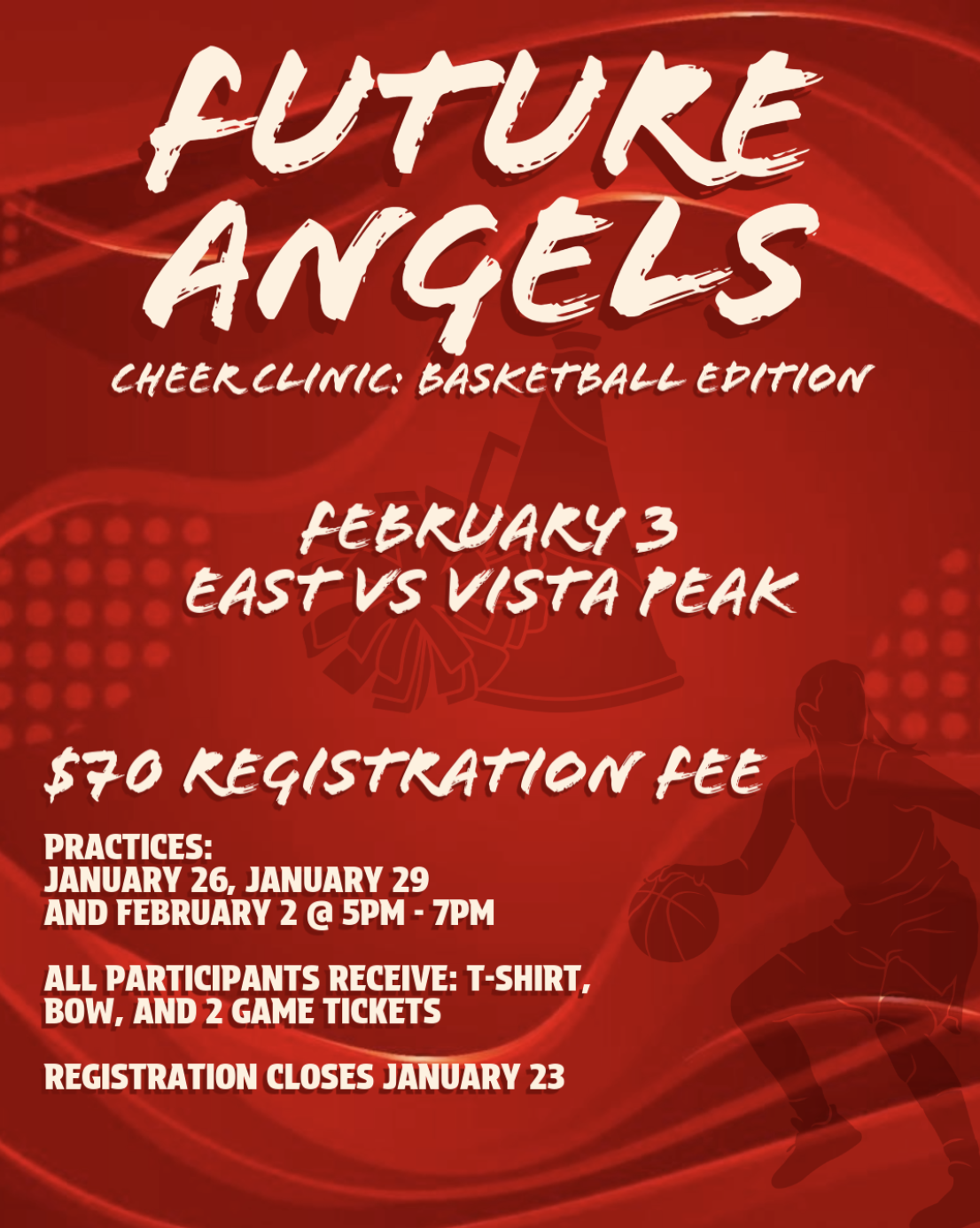 The Future Angels Cheer Clinic: Basketball Edition will happen on February 3rd! There will be practices held before the performance at the game on January 26th, 29th and February 2nd from 5 pm - 7 pm. The registration fee is $70 which includes a t-shirt, bow, and two game tickets. Registration closes on January 23rd.