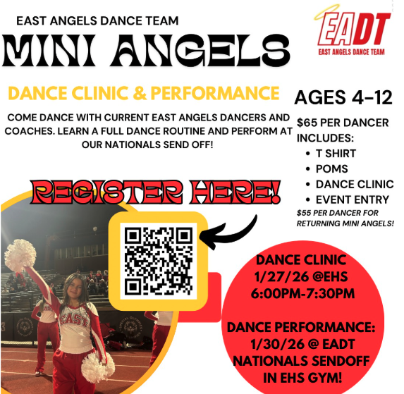 The East Angels Dance Team will be hosting another Mini Angels dance clinic and performance later this month. Come dance with current East Angels dancers and coaches. Learn a full dance routine and perform at our Nationals Sendoff! This event is available to ages 4-12, cost is $65 per dancer ($55 for returning Mini Angels) which includes a t-shirt, poms, dance clinic, and event entry. The dance clinic will be on January 27th at East High School from 6 - 7 pm. The performance will be on January 30th at EADT National Sendoff in the East Gym.