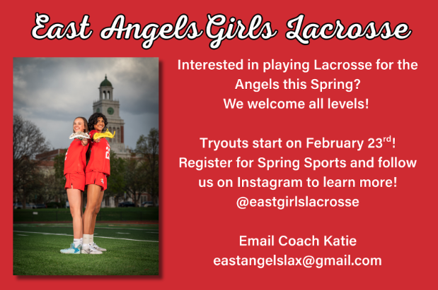 Denver East Girls Lacrosse is holding tryouts the week of February 23rd, and all experience levels are welcome! Whether you’re a seasoned player or brand new to lacrosse, we’ve got you covered! We’ll even provide a stick so you can give it a try. We’re also actively looking for goalies, and all goalie gear will be provided for anyone interested. Have questions or want to learn more? Email us at eastangelslax@gmail.com or visit eastangelslax.com. Come check it out—we’d love to have you! |