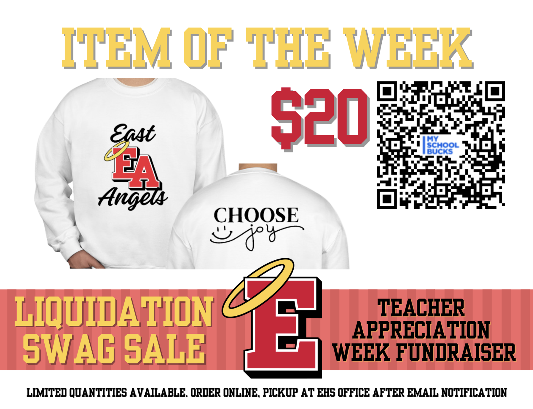 Need some East swag AND want to support our amazing teachers at East? We are cleaning out the storage closets, and all proceeds go towards Teacher Appreciation Week. Item of the Week (2/13 - 2/19): White "Choose Joy" Crewneck Sweatshirt - $20 each
