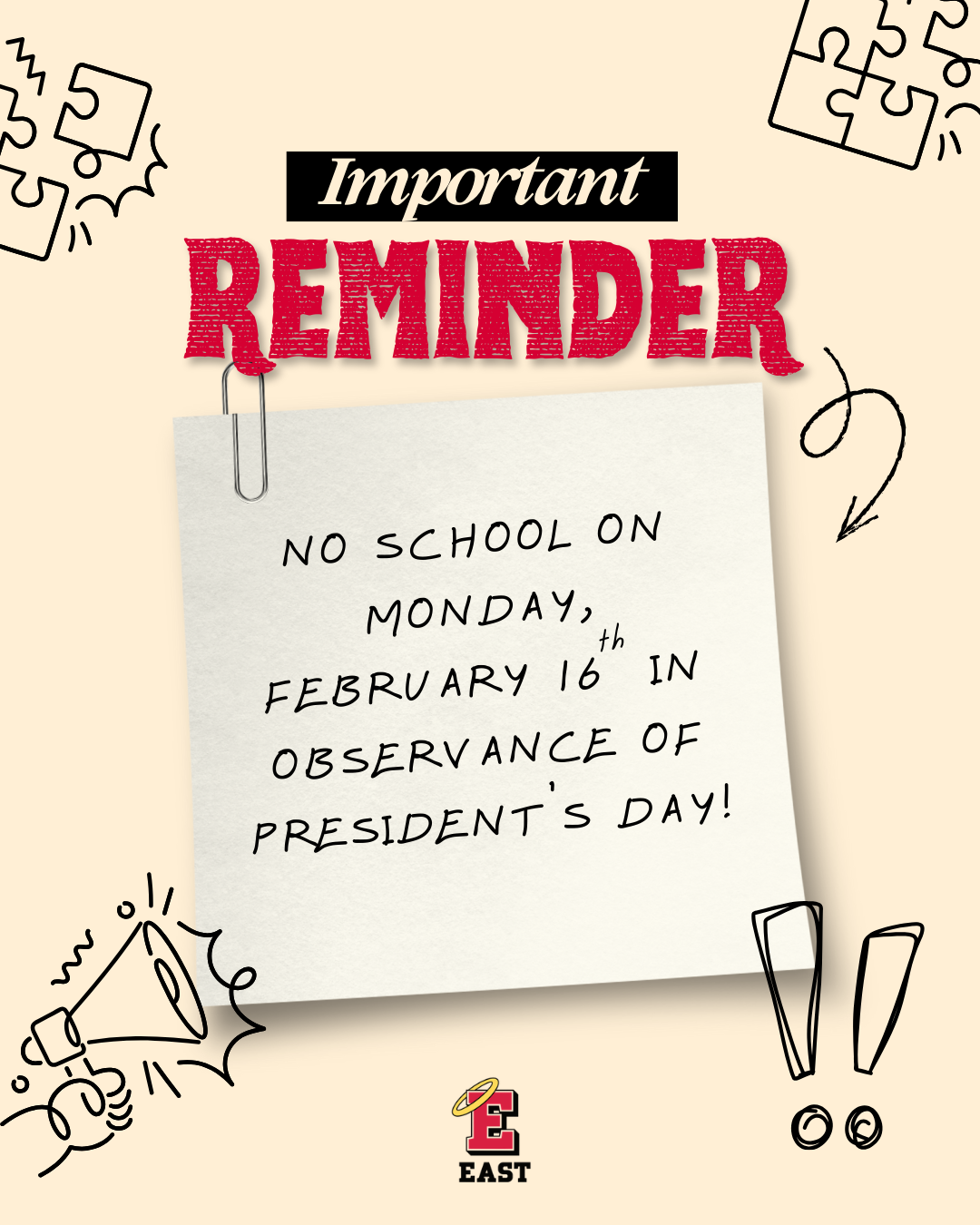 The East PTSA will be hosting a meeting on February 22nd at 5 PM via Google Meet. If you are interested in joining the PTSA, membership for the year is $10. Some of the upcoming initiatives are updating the bylaws, fundraising and social event planning, Teacher Appreciation Week, and creating a health wellness and safety survey. Please reach out to ehsptsa25@gmail.com with any questions!