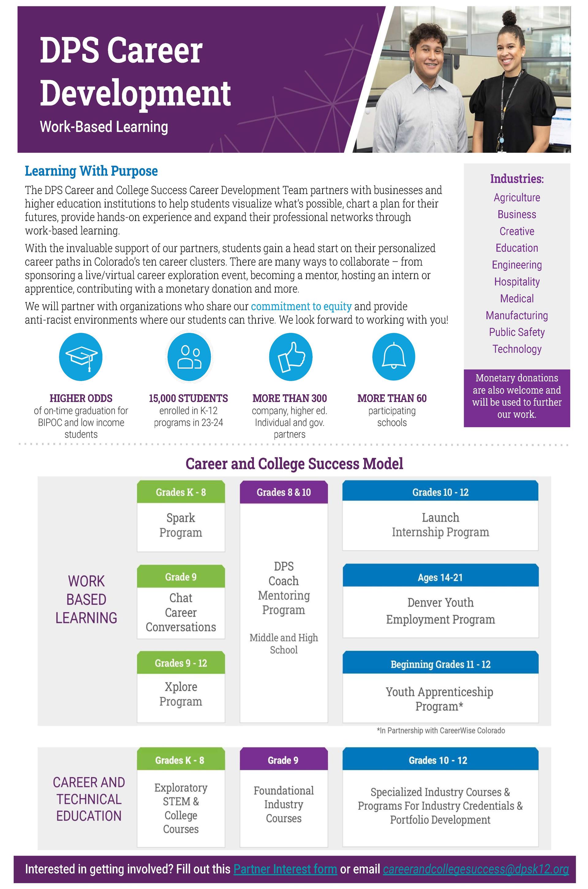College Week might be over, but the purpose behind it is always true - it's never too early to start thinking about your child's future! The DPS Career and College Success Development Team helps students plan for their future career and education with hands-on experiences and work-based learning. Learn more about the opportunities they provide by checking out their flyer! |