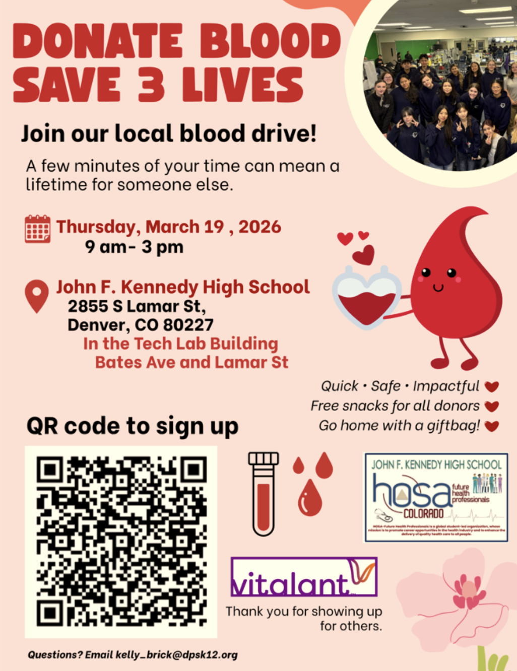 On Thursday, March 19th, JFK HOSA is partnering with Vitalant to host a community Blood Drive in the Tech Lab building (located in the teacher parking lot) from 9:00 a.m. to 3:00 p.m.