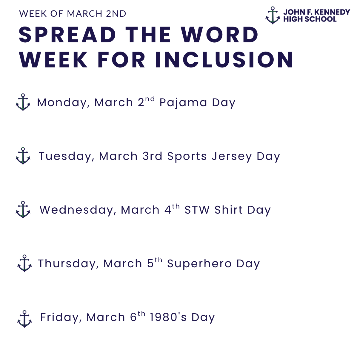 Monday, March 2nd: Pajama Day Tuesday, March 3rd: Sports Jersey Day Wednesday, March 4th: STW Shirt Day Thursday, March 5th: Superhero Day Friday, March 6th: 1980's Day |