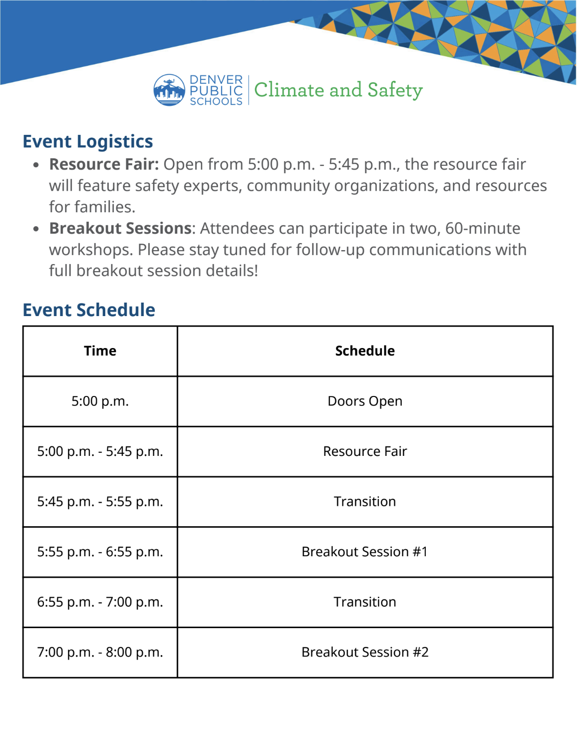 DPS Safety Summits are community-focused events that bring together schools, families, and local partners to share important safety information and resources. Topics will include school safety, emergency management, bullying prevention, substance use awareness, and available community services. These events are a great opportunity for families to ask questions, connect with resources, and build relationships with schools and safety teams.