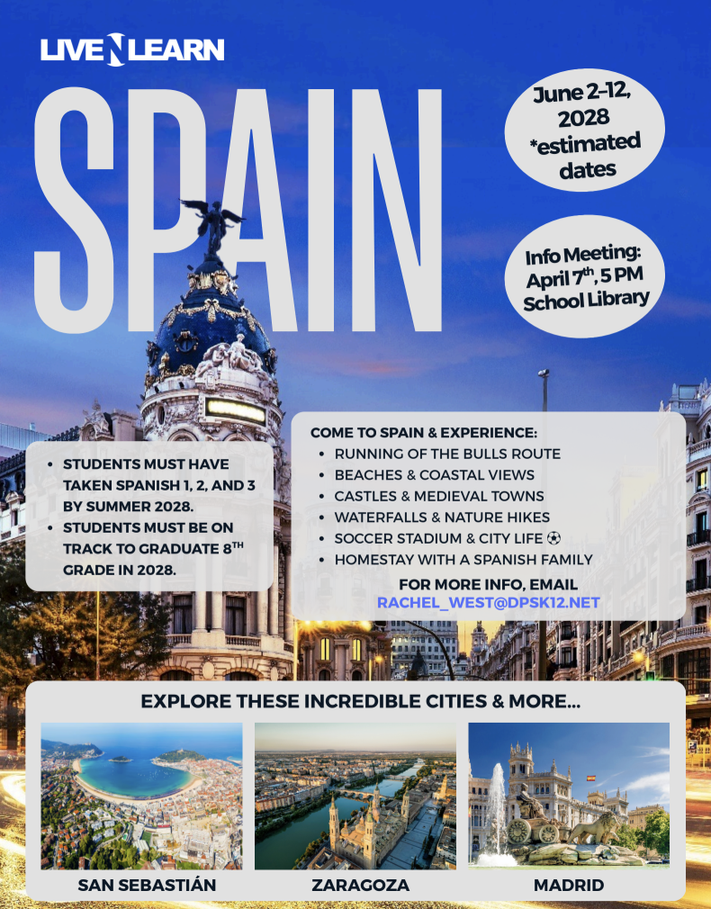 Spain Trip 2028: If your current 6th grade student is interested in attending the Spain trip in the summer of 2028, our first informational meeting will be Tuesday, April 7 at 5:00pm in the library. Live ‘N Learn, the company that organizes the trip, will be on hand to tell you all about our fantastic trip for 8th grade Spanish students! Come and learn more about the itinerary, pricing, and get answers to any questions you may have! This meeting is primarily for parents to attend and find out more about the program.