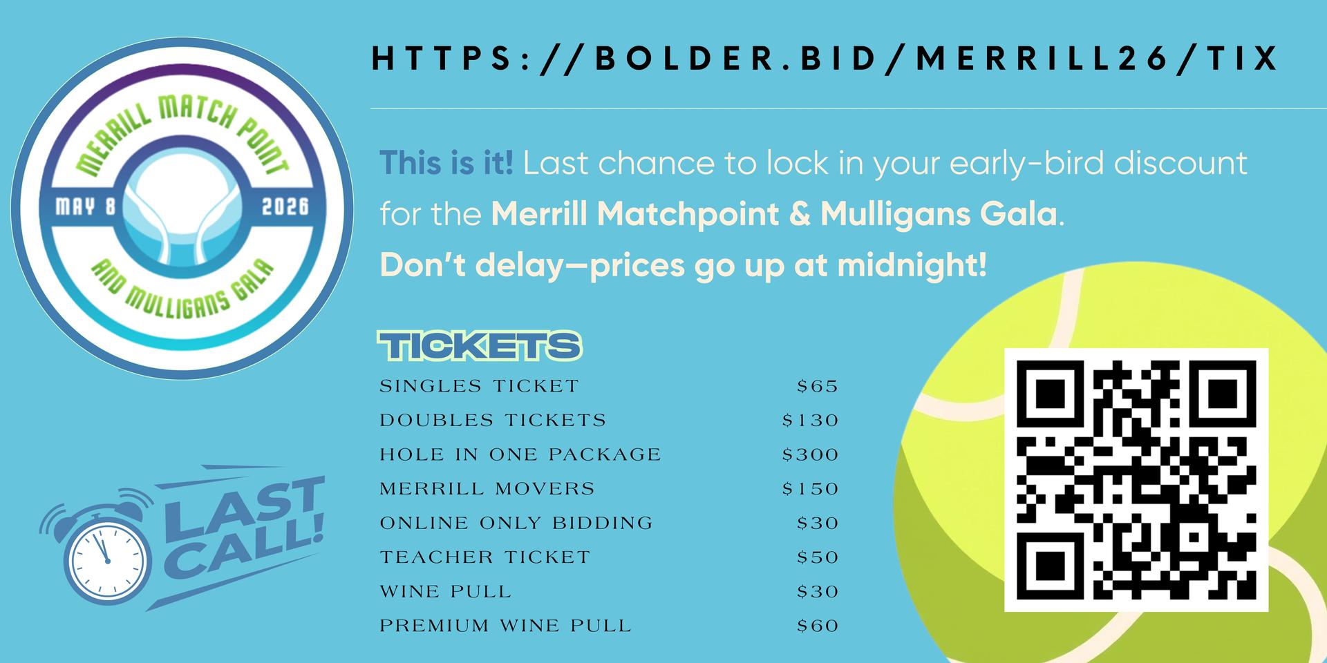 Don’t miss your chance to save on tickets for the Merrill Match Point & Mulligans Gala. Your ticket includes all-access to the silent auction and the "19th Hole"! Buy your tix now at https://bolder.bid/merrill26/tix |