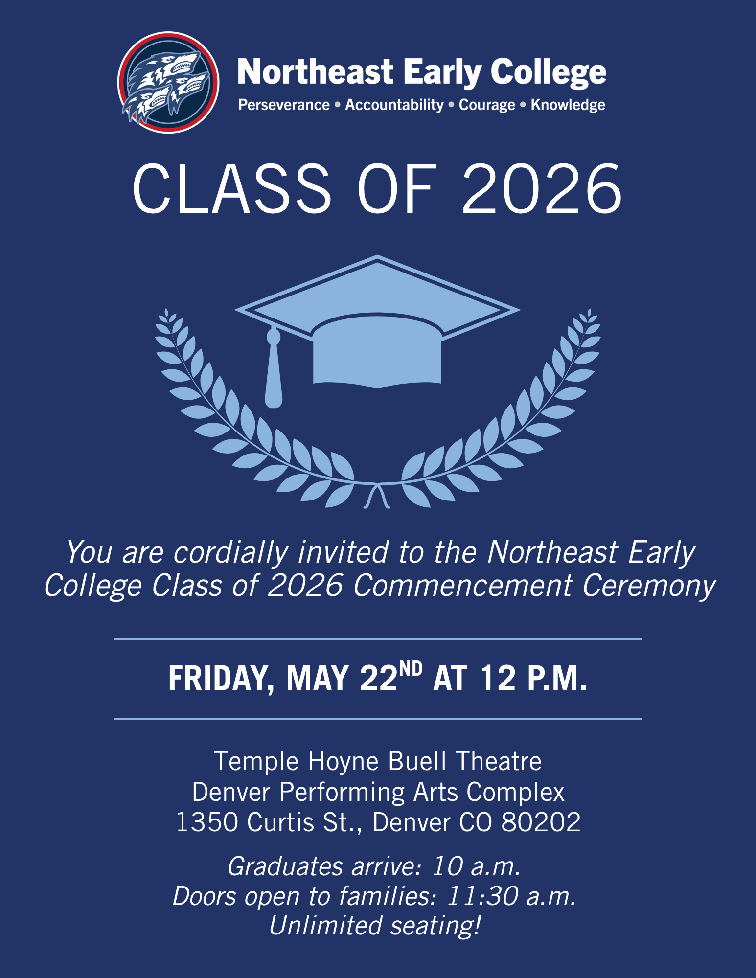 Families, friends and supporters of our graduates are invited to attend the Northeast Early College Class of 206 Commencement Ceremony. It will be Friday, May 22 at 12 p.m. at 1350 Curtis St., Denver CO 80202. Graduates should arrive at 10 a.m., and doors open to families at 11:30 a.m. We have unlimited seating! |