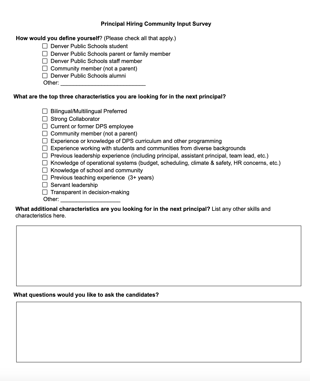 To continue to honor this approach, we invite all members of our school community to complete the Principal Hiring survey, attached below, to list characteristics you would like to see in the next principal. Please complete this survey by Thursday, March 12, 2026 by these methods below: |