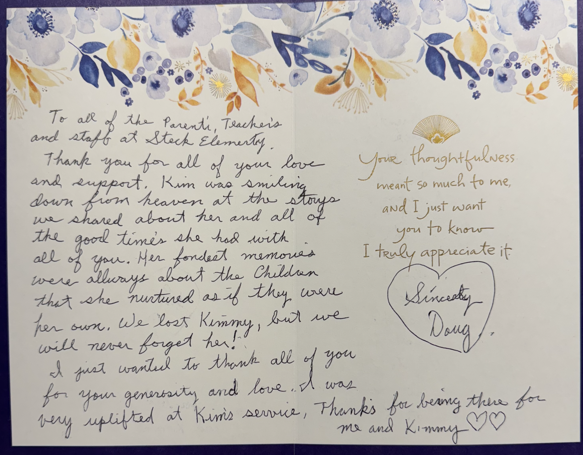 Finally, we’d like to share a beautiful letter written to our community by Kim Jonker’s husband, Doug. As a reminder, our community came together to support their family through meal deliveries, artwork, and heartfelt cards. As you’ll see below, these messages and acts of kindness meant so much to Doug and his family. Thank you, Steck, for all you do to make our community such a caring and supportive place. 💙 |