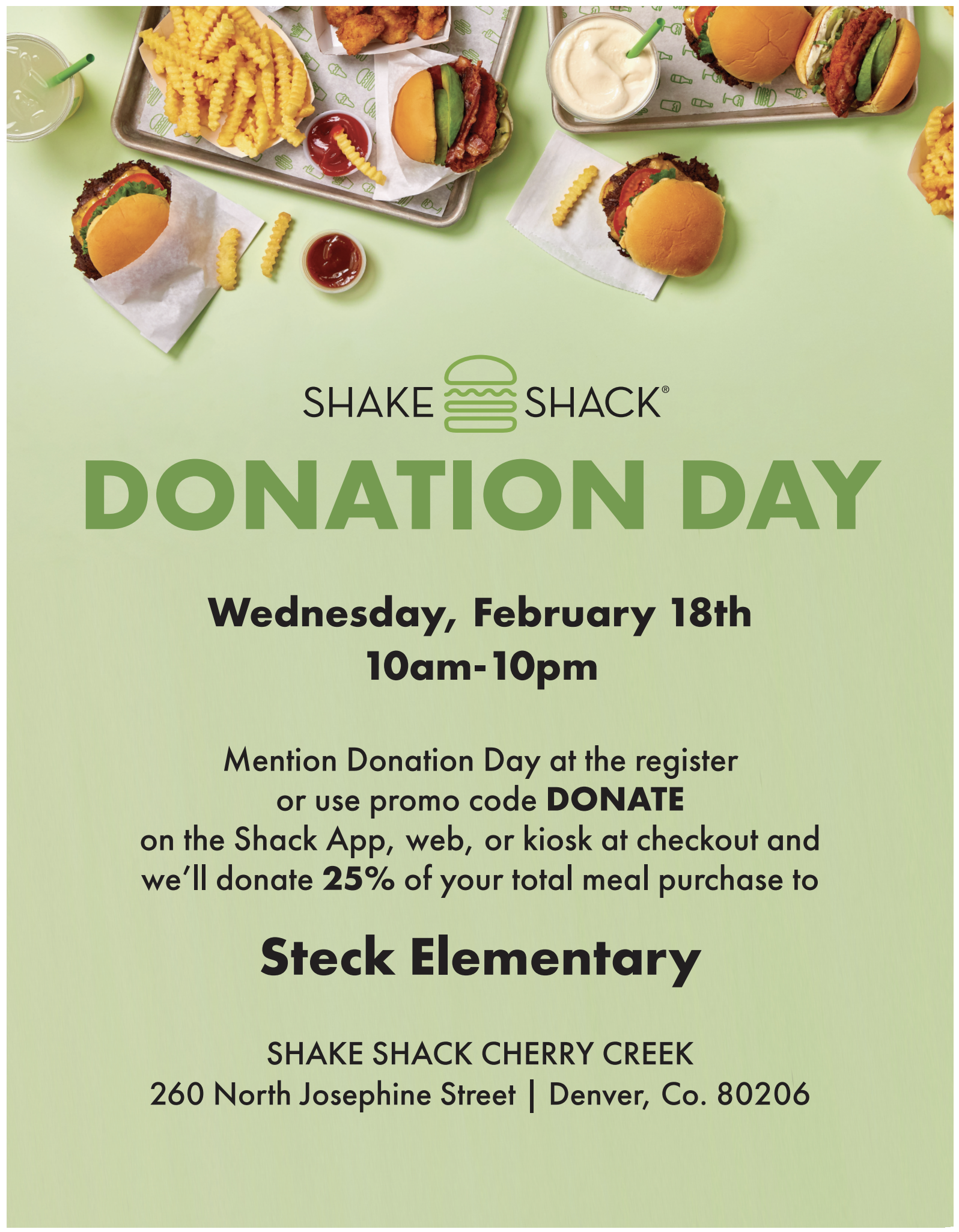 We've got a good one tonight - Shake Shack is offering a TWENTY-FIVE PERCENT give-back for anyone who dines in honor of Steck! So let's head down to this Cherry Creek fave and show our school some love (it's also a great excuse to spoil yourself with a milkshake which - yes - adults deserve too ;)