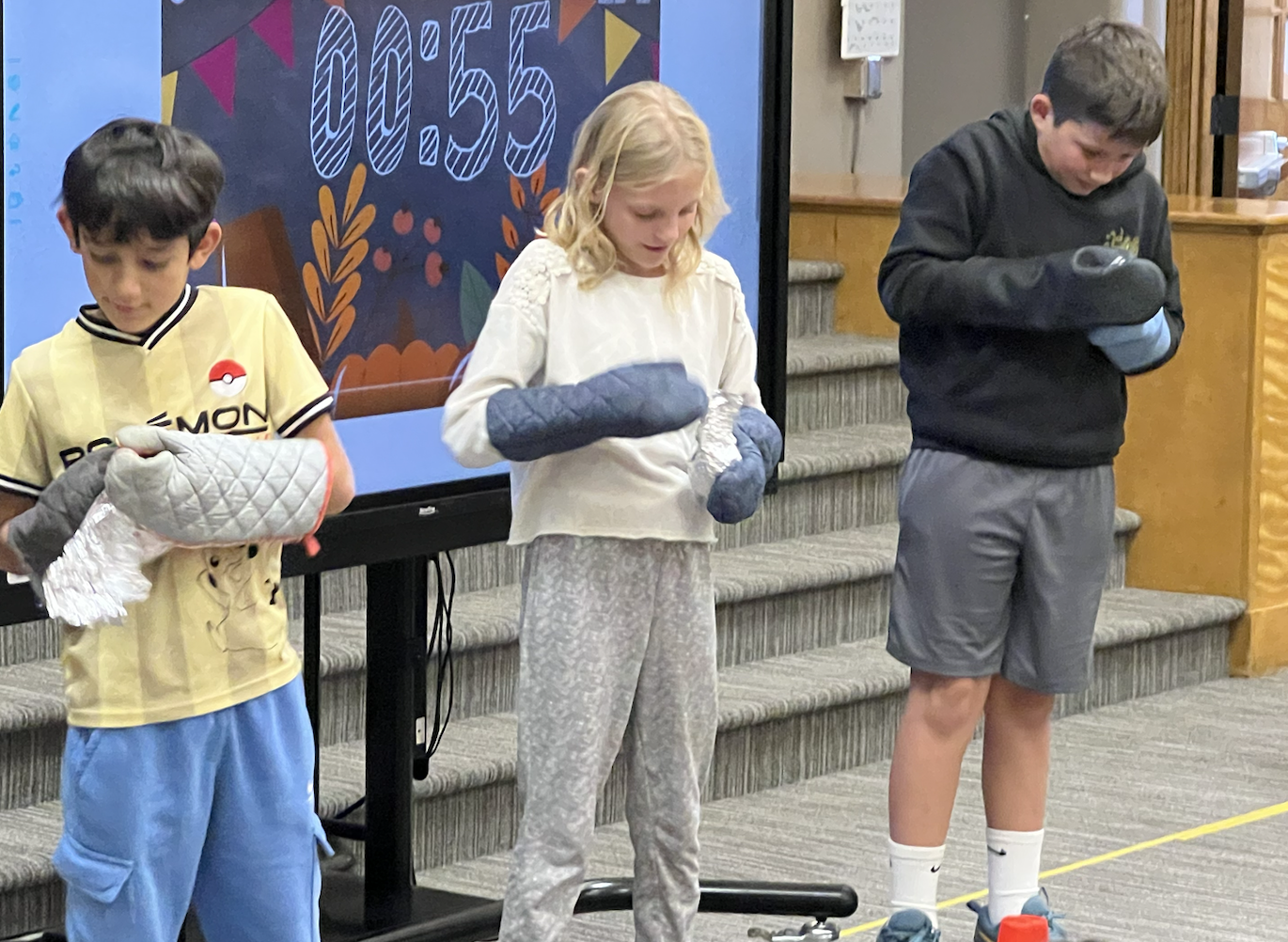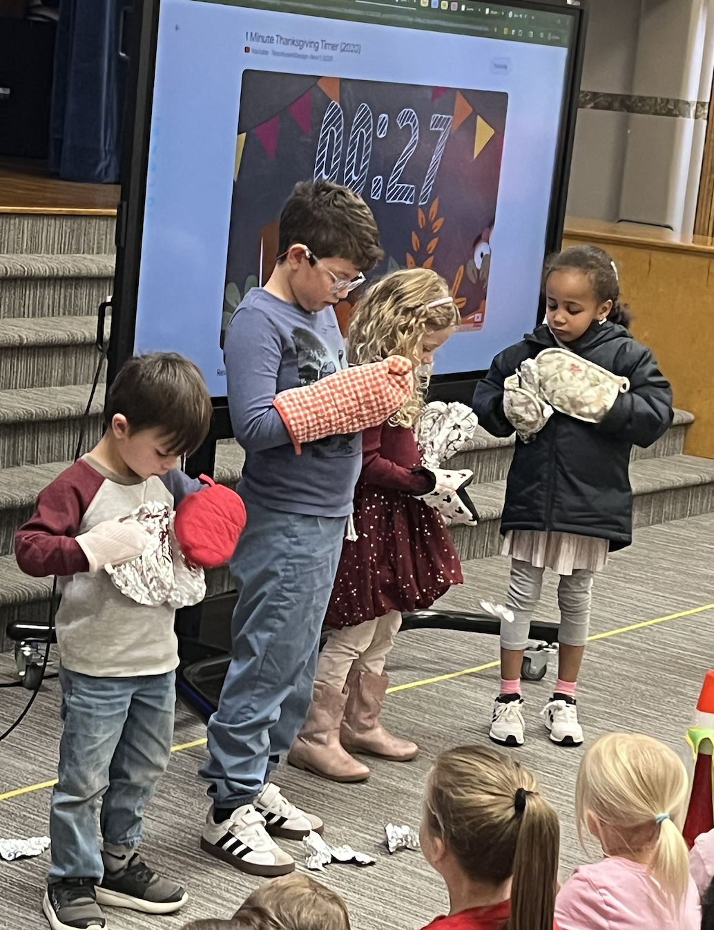 This months' game: Unwrap the Thanksgiving food while wearing oven mitts!