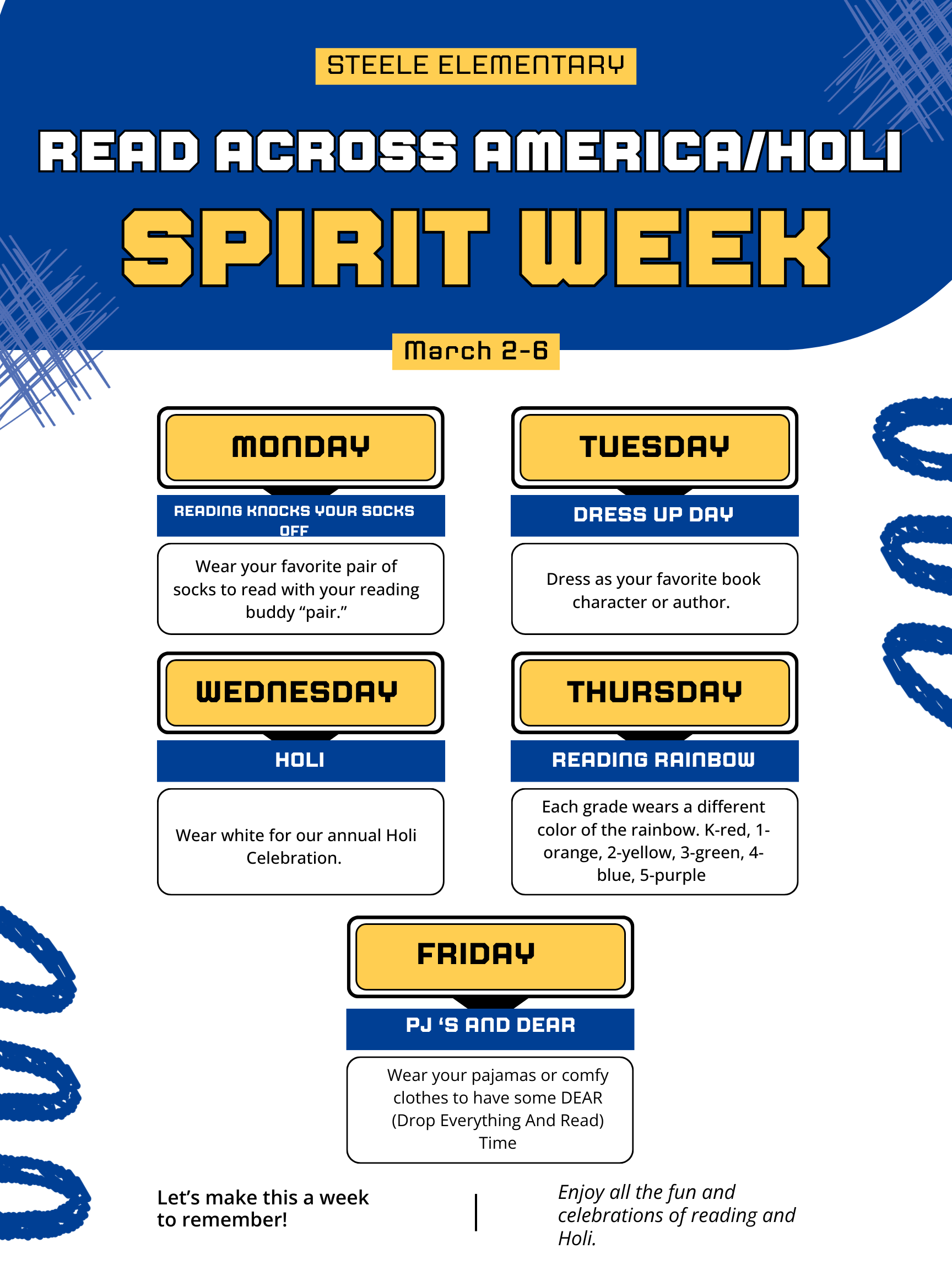 Save the date for Steele Holi Celebration Wednesday 3/4 at 2:50. We will meet on the field at 2:40.