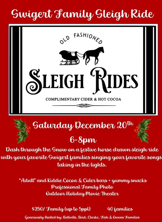 From the Auction Buy-A-Shares - we have 5 Family Tickets for sale to the annual Sleigh Ride Buy-A-Share party. If you've ever wanted to spend the night in a Hallmark holiday movie, this will exceed all your expectations- Draft horse drawn carriage, Professional family photos, Adult & Kiddo Cocoa and treats bar, outdoor movie theater, and so much more!!