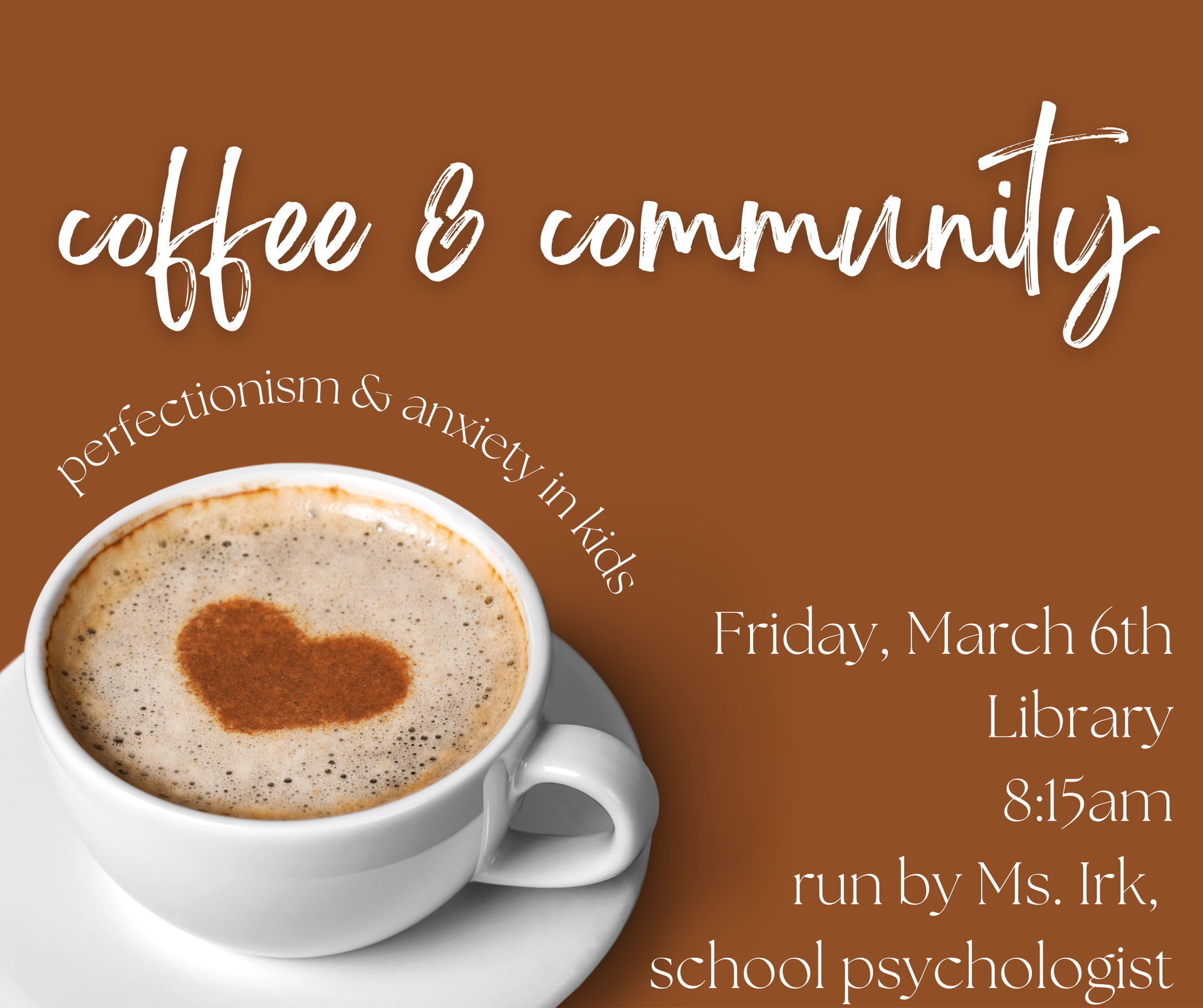Join us for a Parent Coffee focusing on Perfectionism and Anxiety and how to help your kiddo! Hosted by our school psychologist, Ms. Irk. Friday, March 6th after drop off around 8:15am, in the library.