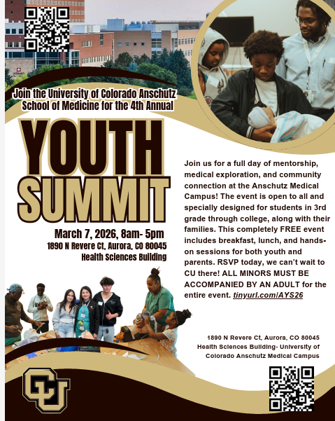 The CU Anschutz HOPE Office is hosting the 2026 Annual Youth Summit on Saturday, March 7, 2026 from 8:00 AM to 5:00 PM. The event is designed for students in grades 3 through 5 and provides a valuable opportunity for young learners to explore careers in medicine through engaging, hands-on