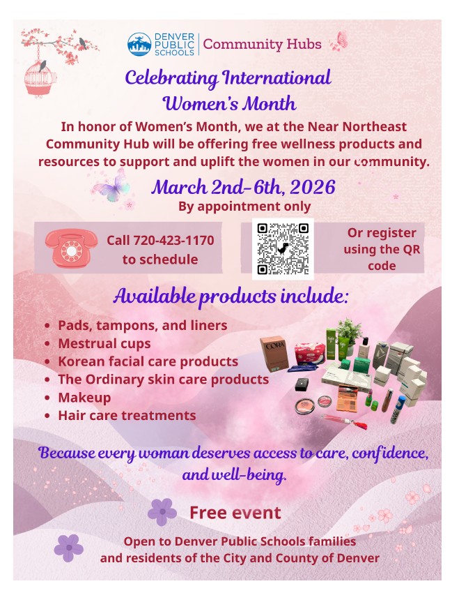 International Women’s Month Wellness Event (March 2–6, 2026) - In celebration of International Women’s Month, the Near Northeast Community Hub will host a special wellness event for DPS families, Denver residents, and DPS staff from March 2–6, 2026. Free wellness products and community resources will be available to support the women in our community.