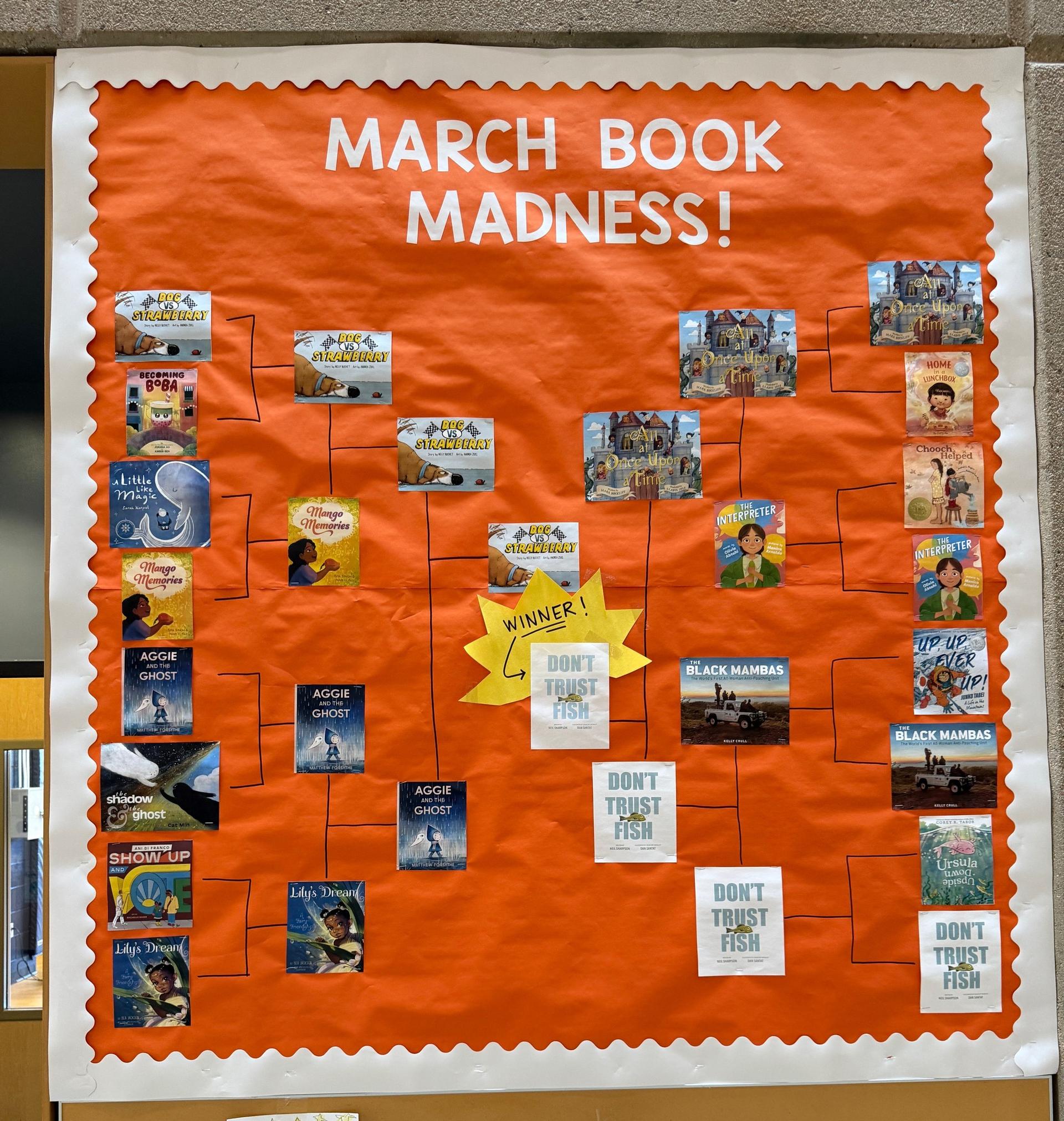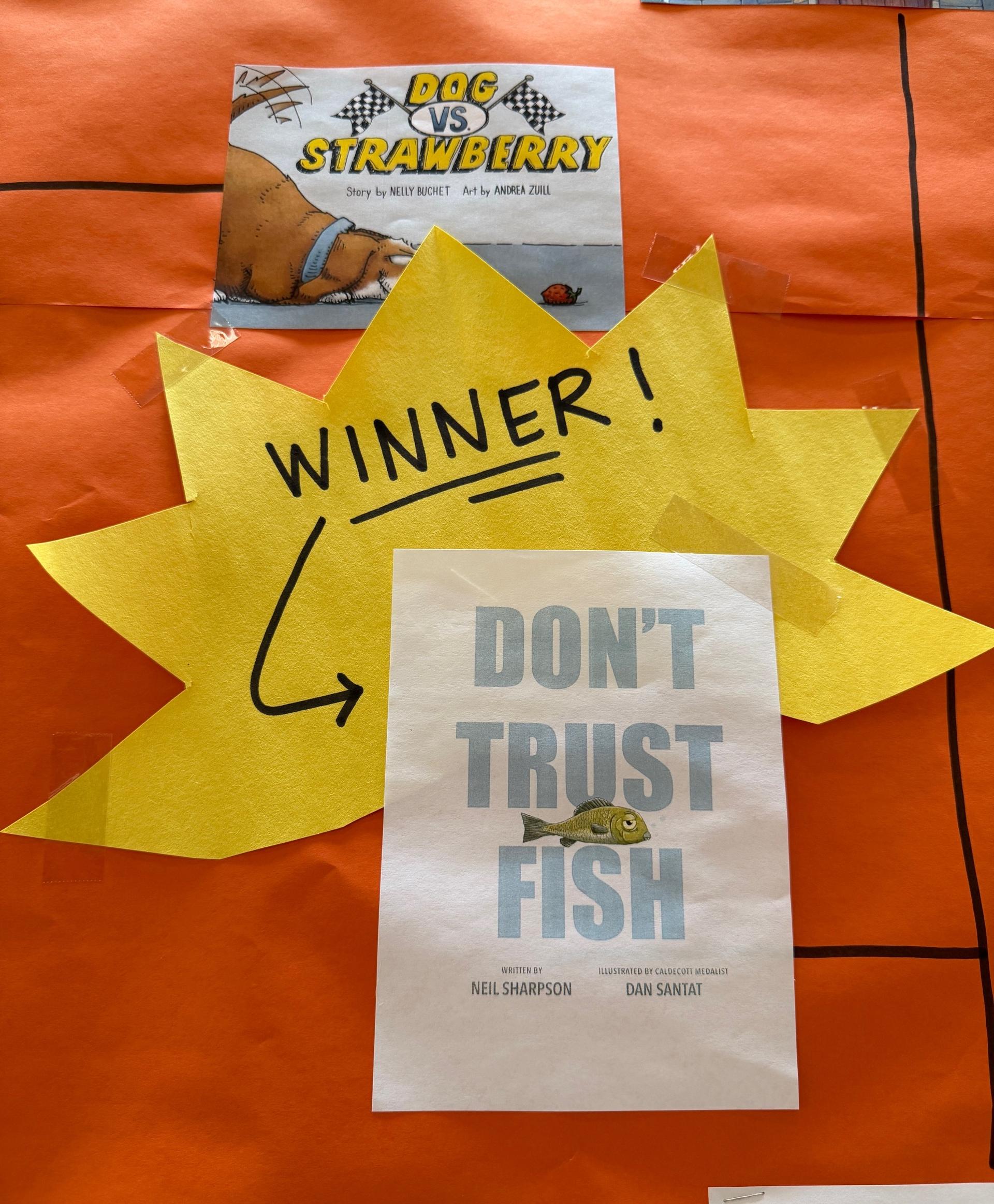 All of our ECE-5th grade students participated in March Book Madness bracket and read two to three children's books a week. They all voted for the best books along the way and the overall winner was Don't Trust Fish by Neil Sharpson. Check out the author reading it out loud here.