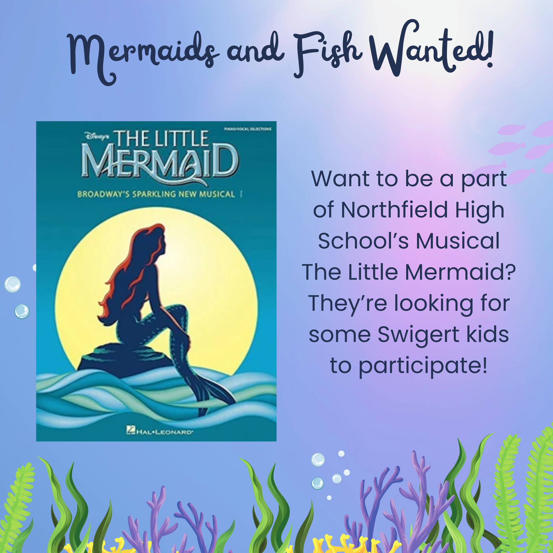 Students in Northfield High School’s Musical Theatre classes will be performing in “The Little Mermaid, Jr.” We are so excited to have Swigert students be a part of our world!
