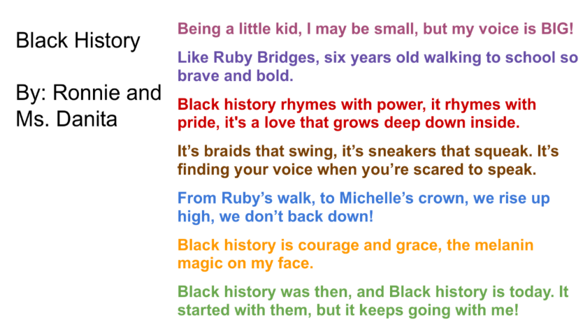 Also, third grade hosted a student poetry jam right before spring break. Students had a great time sharing their poetry with the grade level and it was quite inspiring. I wanted to share Ronnie's poem from Ms. Colter's class. It is a powerful example of student voice and representation. The picture of her is from the literacy night poetry slam where she also shared! You can watch some of the videos of the slam here.