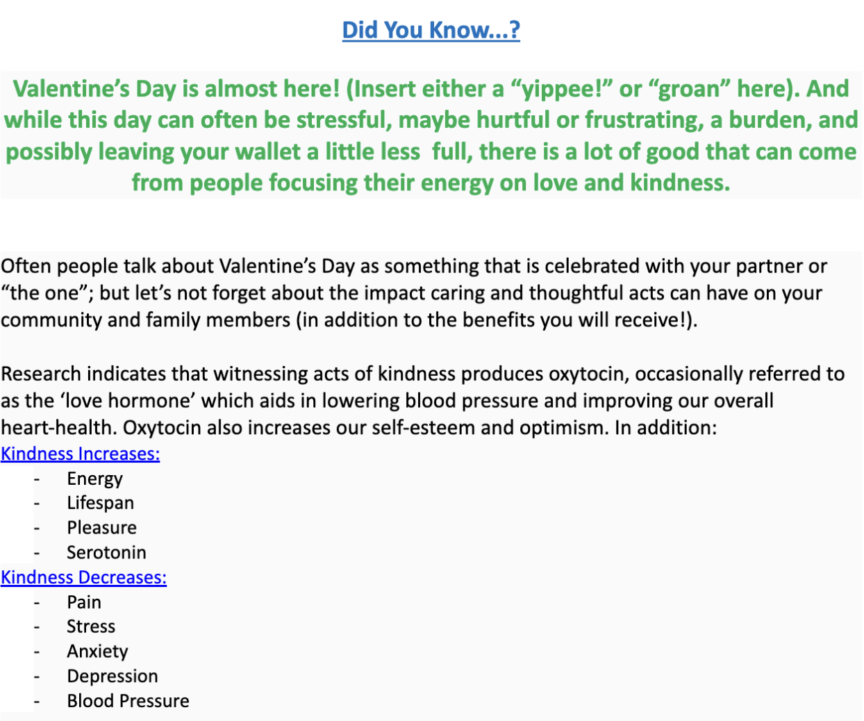 Mental Health and Social Emotional “Did You Know”: Compiled by Natalie Koncz, Ed.S., NCSP and Samanda Davis, LCSW, MSW. Resources: www.randomactsofkindness.org |
