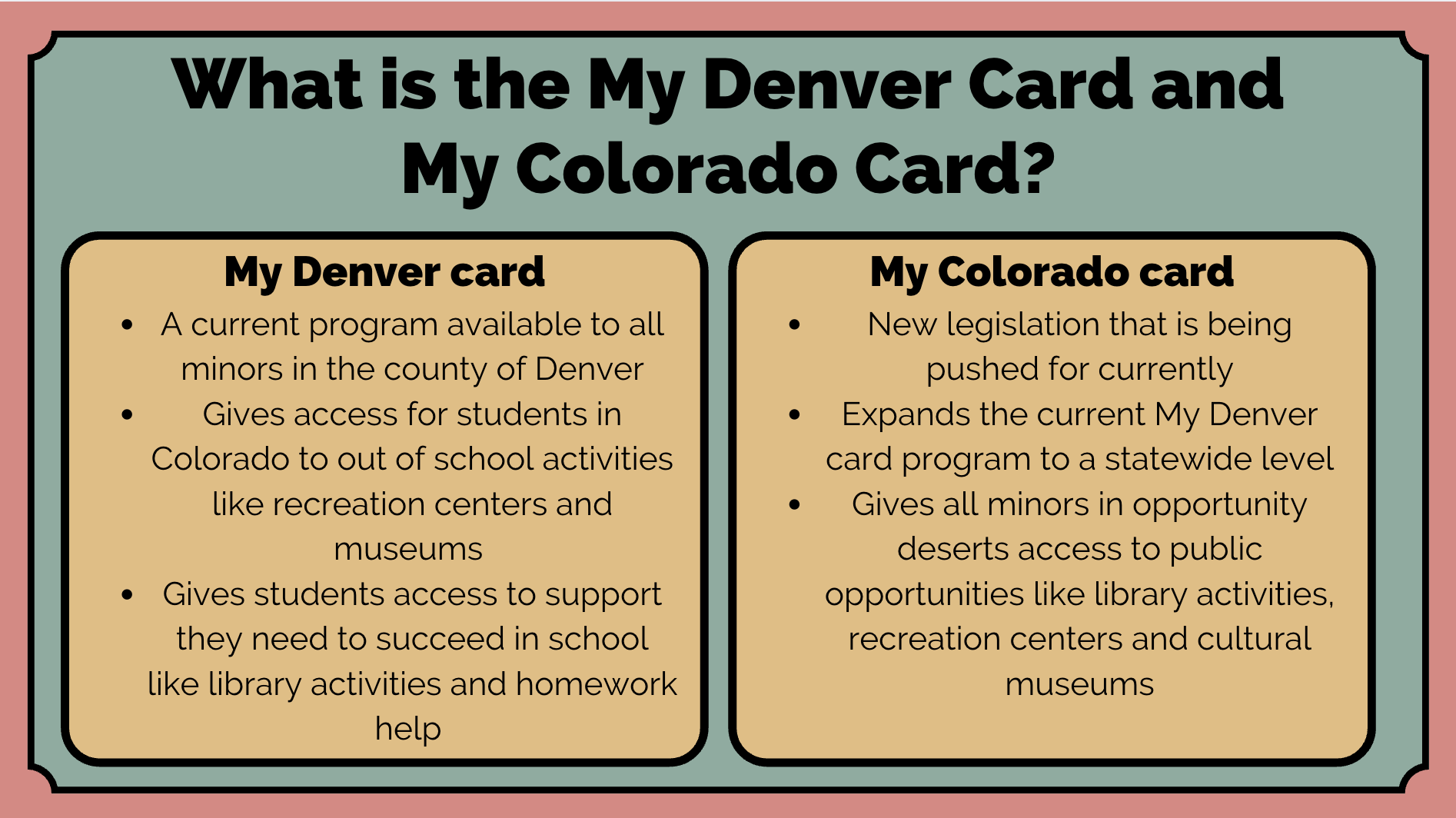 The current My Denver card allows for all youth to have unlimited free access to Library Activities, Events, and Homework/Research Assistance, Recreation Center Activity Calendars for Arts, Education, Sports, and Swimming, Cultural Facilities for Arts, Theater, Museums, including the Denver Zoo, the Museum of Nature and Science, and the Botanic Gardens. The future My Colorado card will expand this level of access for youth to a statewide level, providing essential support to students below the poverty line and those located in rural areas, offering out-of-school activities to grow their interests and obtain free support with school.