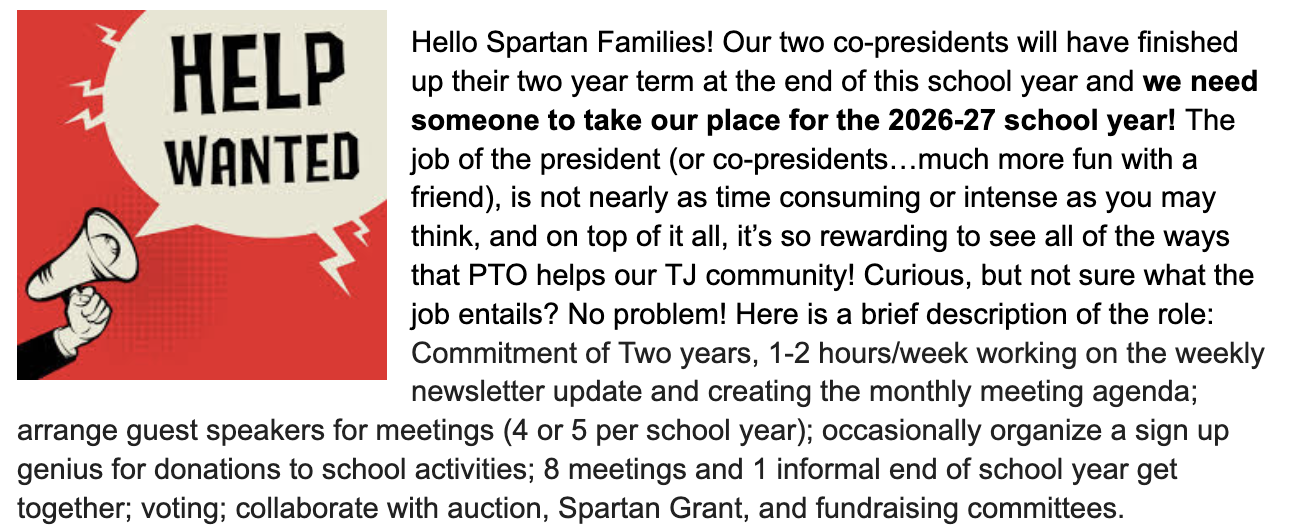 The TJ Together online auction committee is gathering donations. Do you own a business you want to be included in the auction and recognized in our newsletter? Would you be willing to host a party to be scheduled late this summer or early next school year? All ideas considered! Click on the form link to submit your item or idea.
