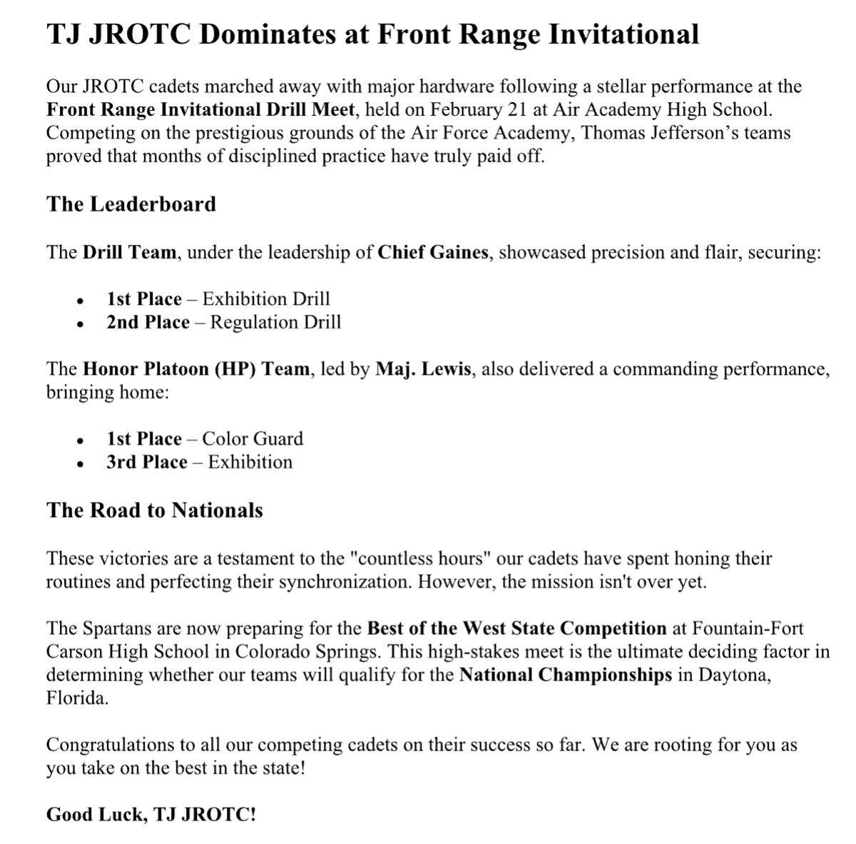 I am very thankful to the support we continue to receive from the TJ Community. This is a team effort and on behalf of the TJ DECA Program we want to thank our Administration, Staff, and CTE Department for the continued support of providing our students a chance to prepare for their post-secondary careers. A very special thank you to Erin Thompson, Brittany Nicolo, and Andre Skari for serving as chaperones on this adventure. I am extremely proud of all of our DECA Competitors that attended and I want to thank them for demonstrating unparalleled class and character, once again showing why TJ DECA is “The Standard By Which Others Are Measured.” Listed below are the awards and accomplishments of the TJ DECA Chapter at this year’s event.