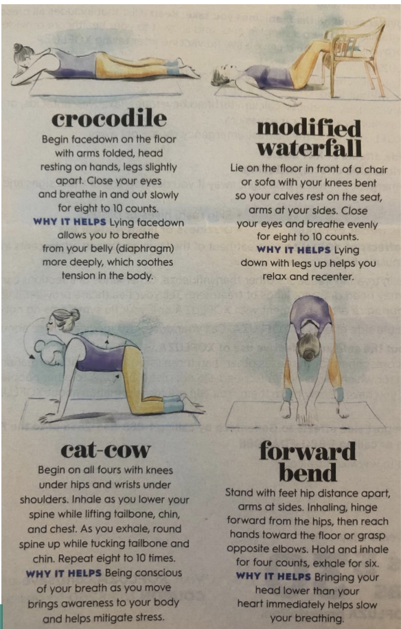 Your stomach may churn, you may feel dizzy, your heart may pound, or you might get a headache. If you notice when you start to feel anxious, take a deep breath to help reset yourself. Then engage in some body movement/stretches to provide immediate mental and physical relief. |