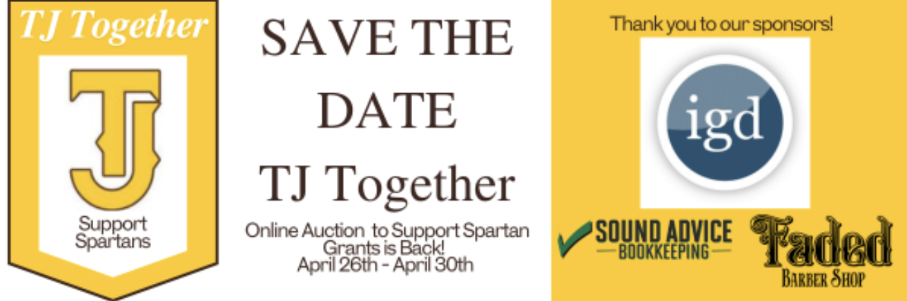 Coming in April! TJ Together! Our 9th annual online auction to benefit Spartan grants. Mark your calendars. Bid from your couch! April 26th-30th |